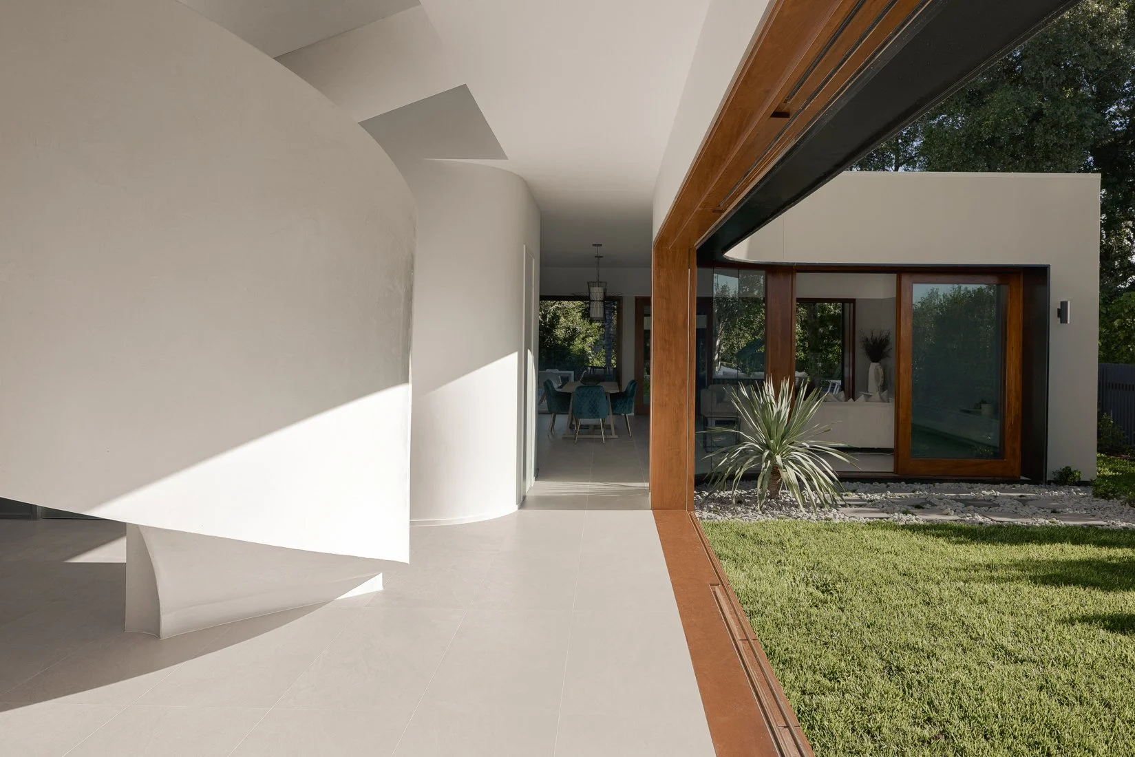 Combining curves with more linear elements, a sense of balance is created in the spaces where the two intersect. Greeted with such a grand entrance and the sculptural spiral staircase, there is a momentous sense of occasion created from the beginning interactions with the home, that then continues to build throughout. With a consistent and light palette used across the two levels of the home, timber and stone are inserted to add a natural touch and to imbed a timelessness – befitting of its coming chapters.”